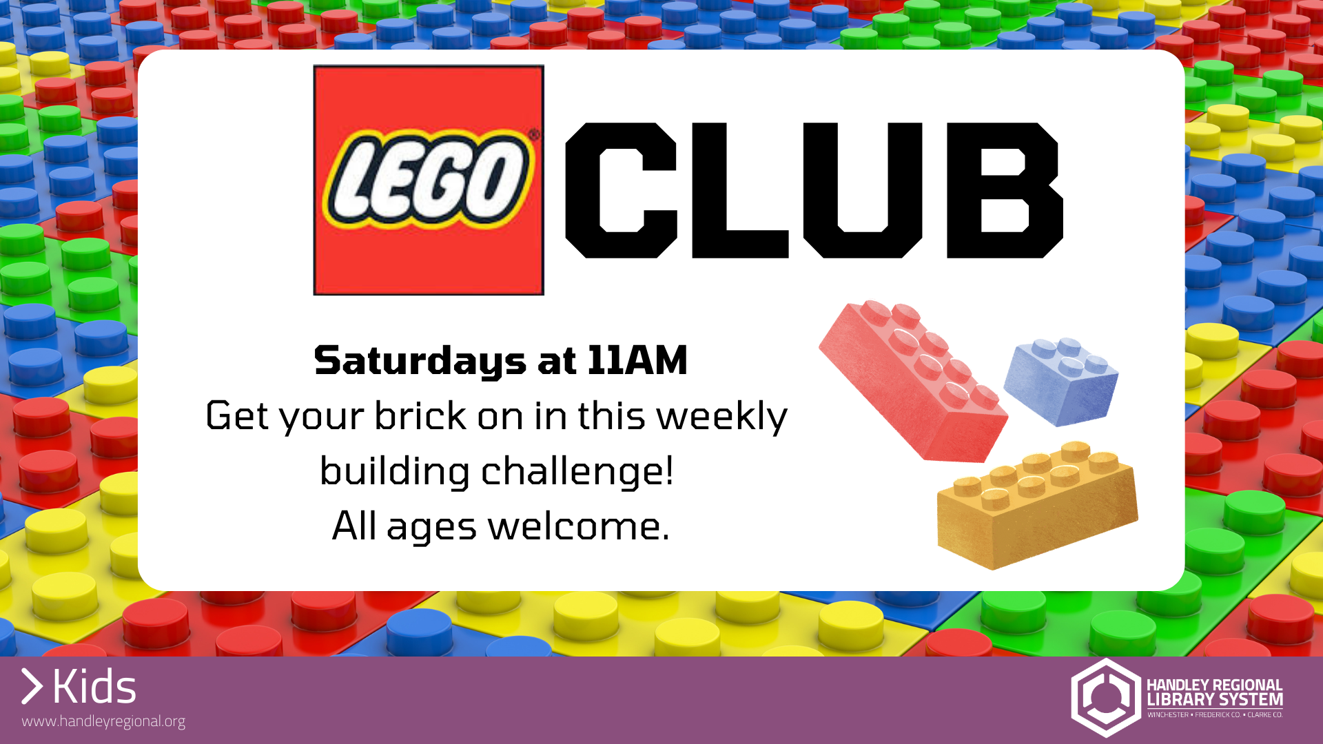 Programs, events, and daily happenings sponsored by Handley Regional Library System may be photographed or recorded.  Attendance at any sponsored program, event or general library use constitutes the consent of all attendees and the consent of the parents or legal guardians of any minor children in attendance, to the future broadcast, publication, and other use of photography or videos at the sole direction of Handley Regional Library System.