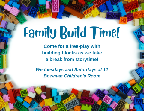 This event is in the "Children" group This event is in the "Ages 0-5" group This event is in the "Families" group Family Build Time Saturday, December 20, 2025 at 11:00am - 11:30am BL Children's Room at Bowman Library Program Type: Arts & Crafts, Music & Movement, STEAM Age Group: Children, Ages 0-5, Families Come and build as a family! Duplos, blocks, Keva planks, and more will be provided. View Details This event is in the "Children" group This event is in the "Ages 0-5" group This event is in the "Families" group Dec 20 2025 Sat Family Build Time 11:00am–11:30am Bowman Library Library Branch: Bowman Library Room: BL Children's Room Age Group: Children, Ages 0-5, Families Program Type: Arts & Crafts, Music & Movement, STEAM Event Details: Come and build as a family! Duplos, blocks, Keva planks, and more will be provided. Disclaimer(s) Library Consent Statement for Photography and Video Programs, events, and daily happenings sponsored by Handley Regional Library System may be photographed or recorded. Attendance at any sponsored program, event or general library use constitutes the consent of all attendees and the consent of the parents or legal guardians of any minor children in attendance, to the future broadcast, publication, and other use of photography or videos at the sole direction of Handley Regional Library System. Photography Notification While we do allow professional photography inside the property of Handley Regional Library System, we do ask that we are notified ahead of time of photoshoots at 540.662.9041 x 25. Photography activities may be limited to specific areas due to reserved use and cannot impede any patron activity using the library.