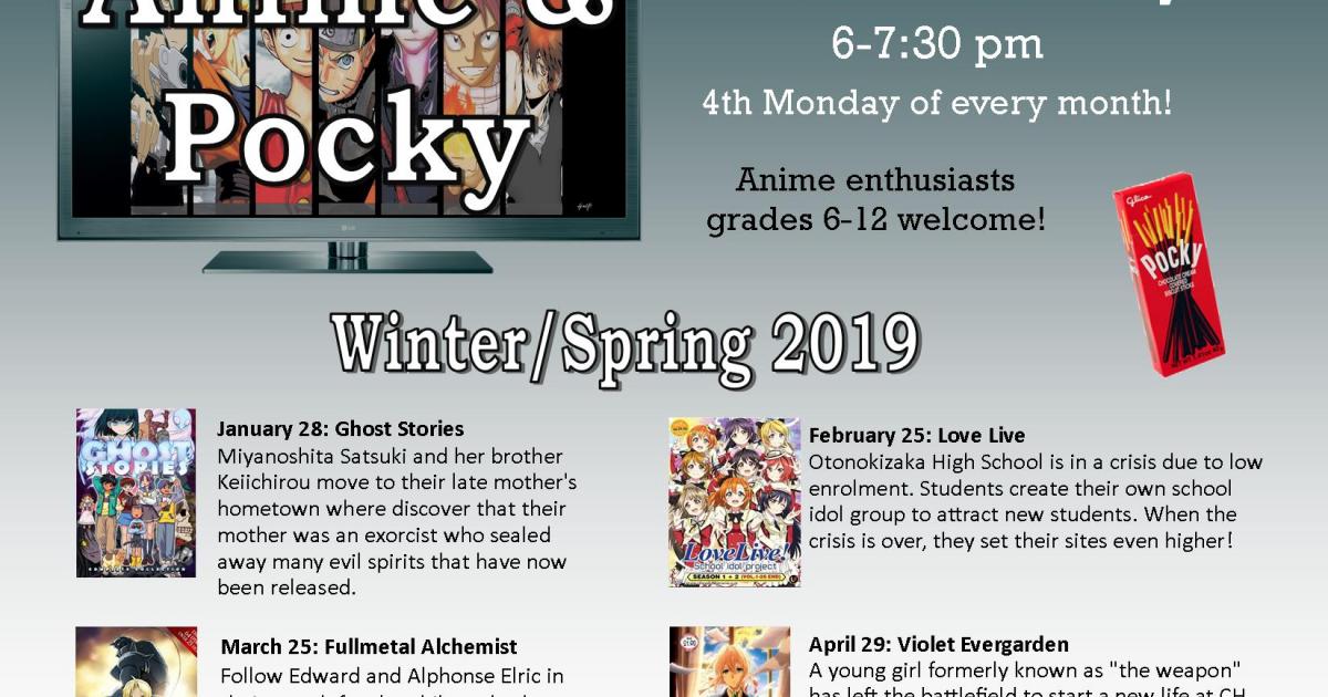 Rescheduled from April 22nd. Eat some pocky and snacks and check out our manga and anime titles.