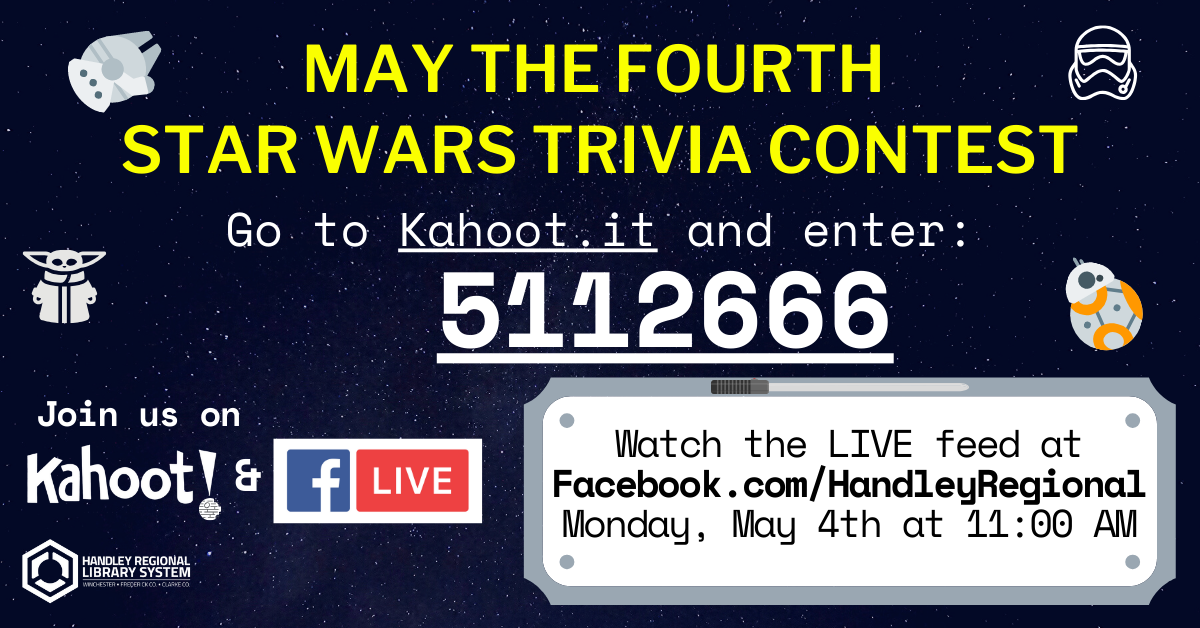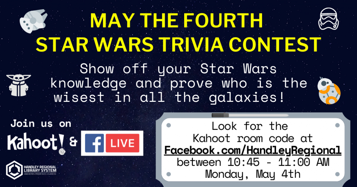 Are you ready to prove your Star Wars knowledge and be named the wisest in all the galaxies? Come celebrate May the 4th with a virtual trivia contest for all ages. Questions will be covering the 3 trilogy movies.