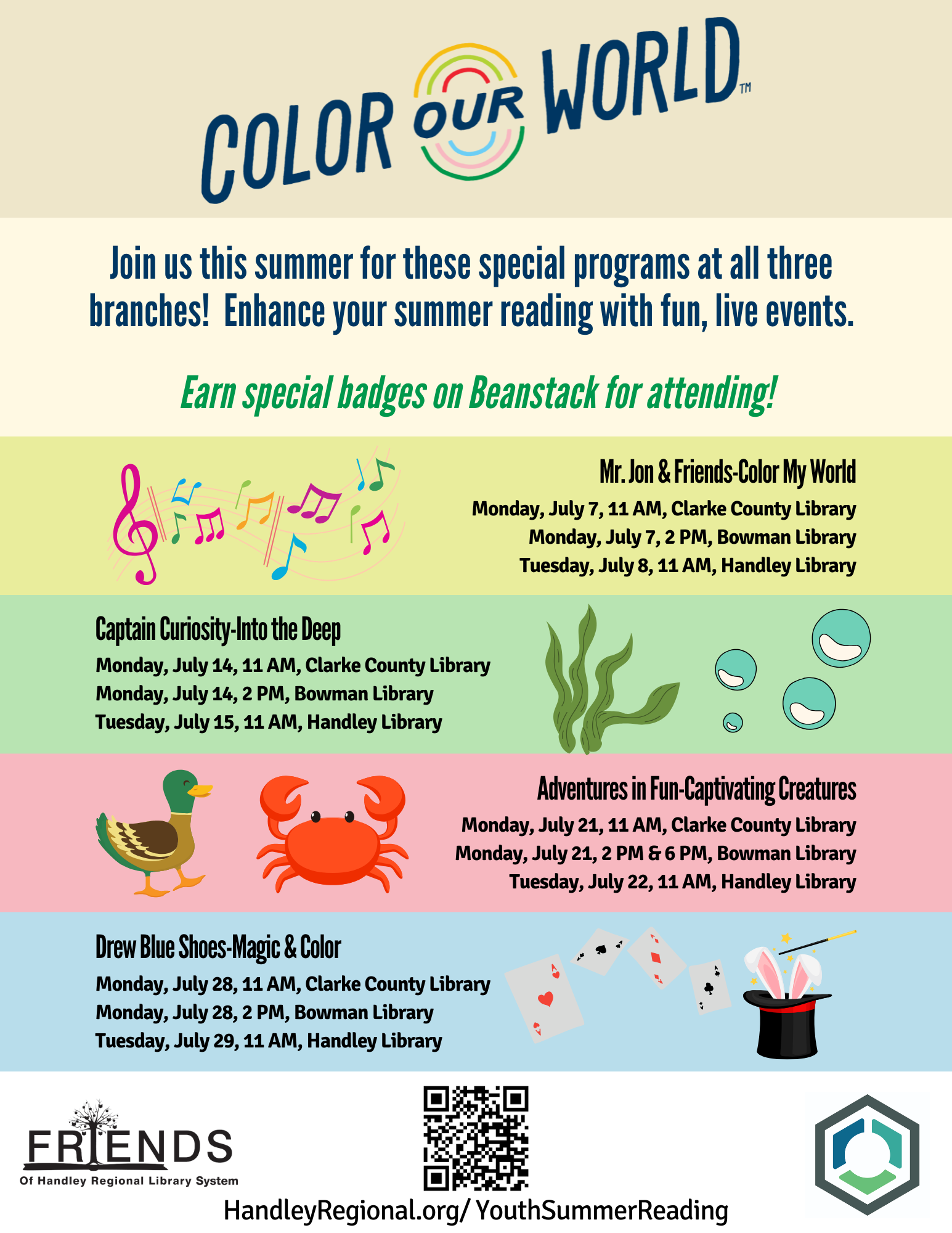 Join us from June 1 to July 31, 2025, as we encourage all ages, from preschoolers to teens, to read during summer break as we enjoy a fun Reading Program "Color Our World".