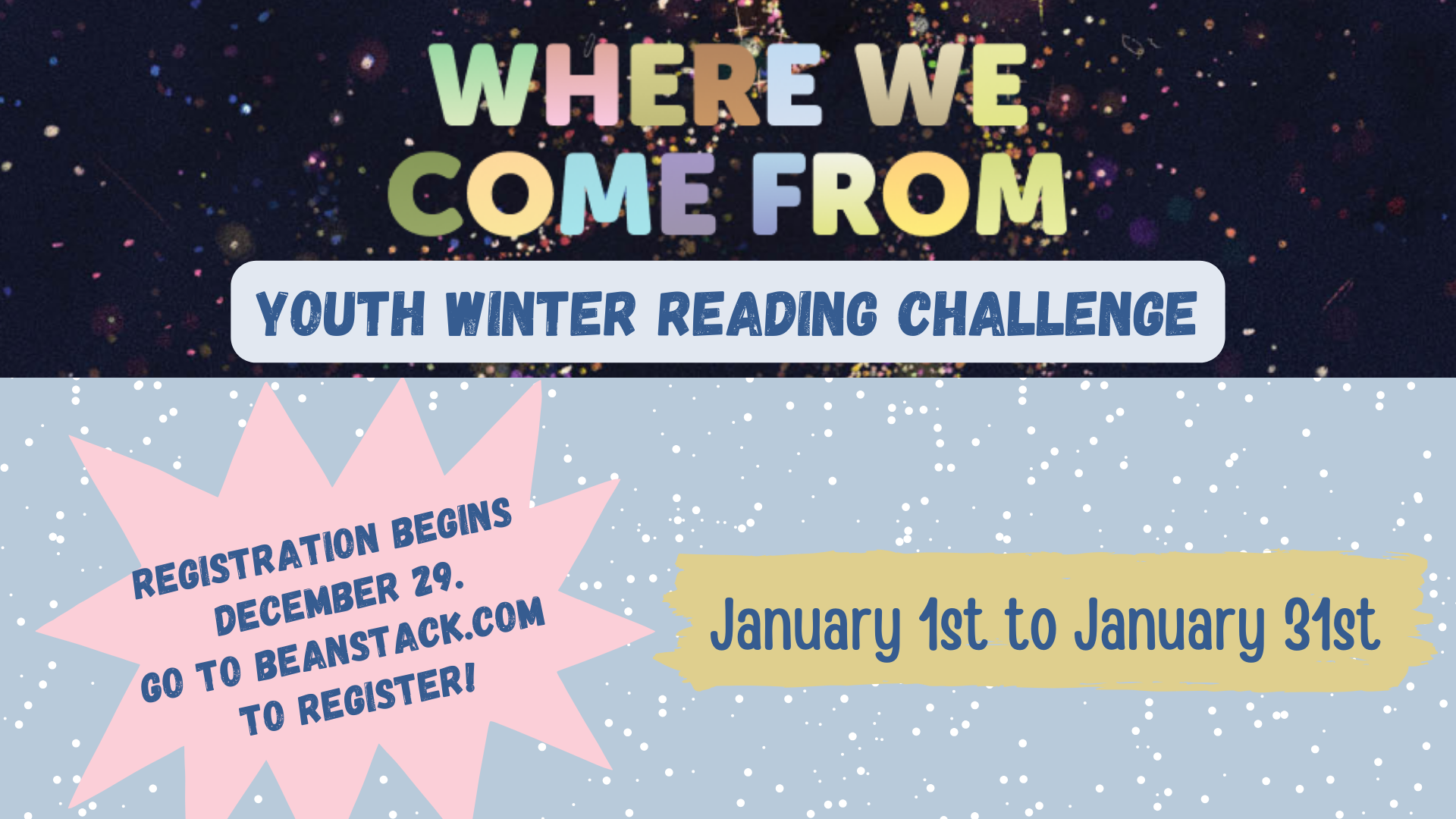 This year's Winter Reading Challenge theme is Where We Come From, inspired by the captivating picture book, "Where We Come From," a poetic masterpiece written by John Coy, Shannon Gibney, Sun Yung Shin, and Diane Wilson. Participants will be immersed in the rich history and captivating stories of individuals, exploring themes of family, history, identity, and belonging. Through the magic of literature, readers will embark on a transformative journey that encourages self-reflection and a deeper understanding of their own personal narratives. All while earning badges on a virtual bingo card!